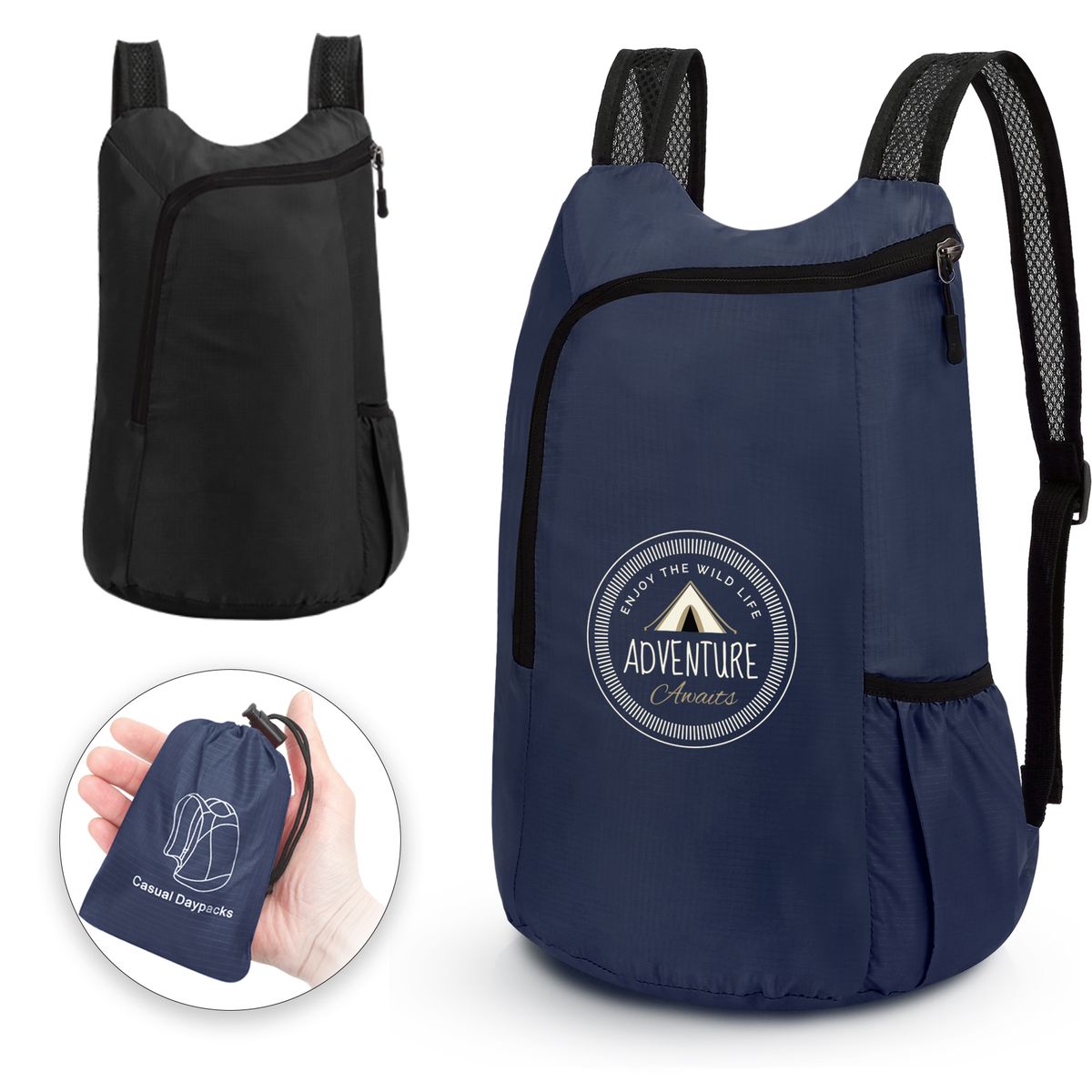 Crafted from water-resistant durable polyester fabric, this backpack easily folds into a compact 3.5'' x 1.1'' x 5.1'' size and stores in its own weather-ready carry pouch. The spacious main compartment accommodates laptops and everyday essentials. Adjustable mesh shoulder straps ensure comfort during extended wear, while dual side pockets securely hold water bottles or umbrellas. Custom logo printing is available for branding. Designed for versatility, this pack adapts to day trips, travel, hiking, school commutes, camping excursions, and shopping needs.